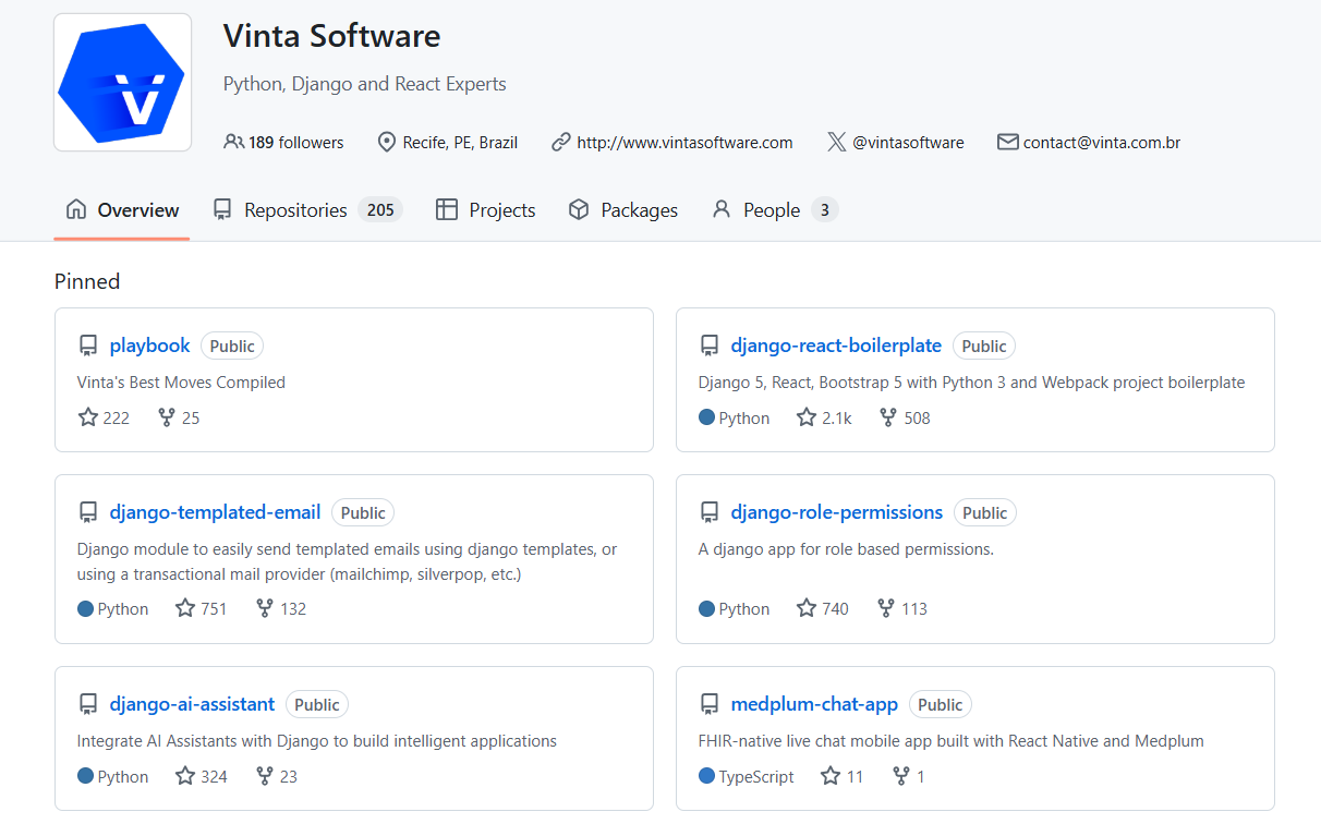 Ultimately, we hope this assessment empowers you to make a well-informed, strategic choice when selecting the ideal software development partner. Vinta Software is widely recognized for making significant contributions to the open-source community, with over 180 repositories on GitHub that thousands of developers worldwide have forked. We encourage you to explore our open-source initiatives.