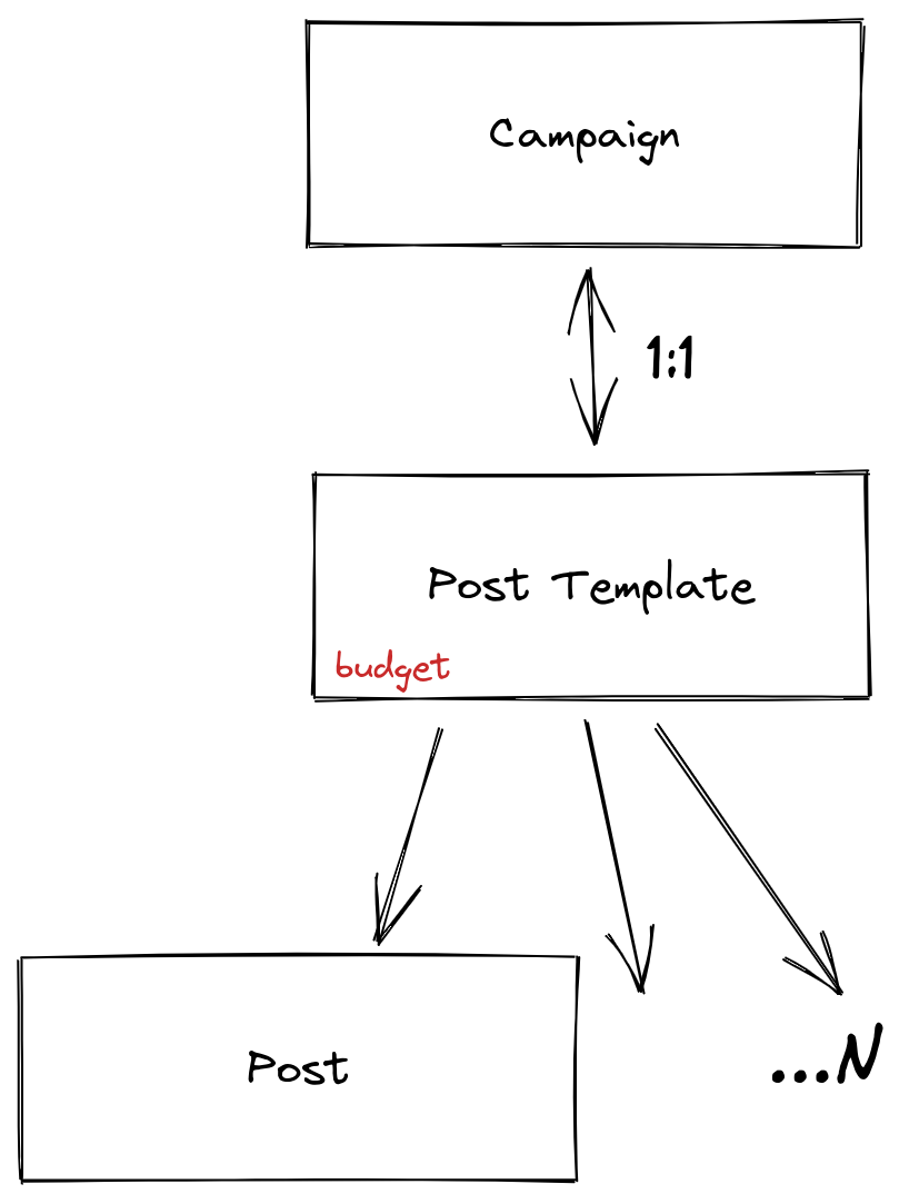 ...Post objects have an 1:N relationship (foreign key) with PostTemplate objects, meaning that a template may have multiple posts under its umbrella, but a given post can only be related to a single template. Since PostTemplate has an 1:1 relationship with the Campaign model, it’s safe to say that all posts that share a same template are part of the same campaign.