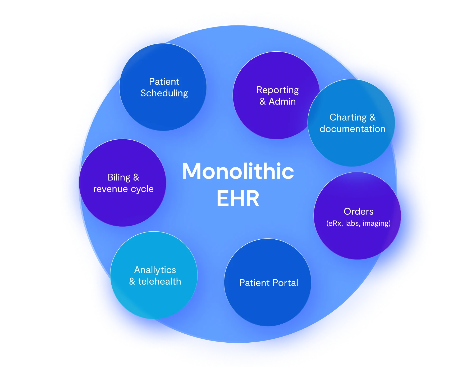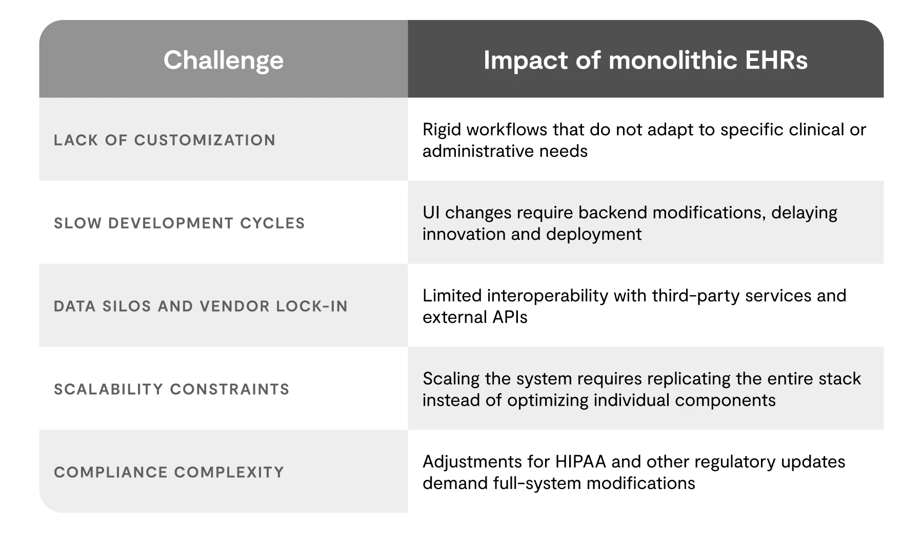 A monolithic EHR tightly couples UI, business logic, and data storage within a single, non-modular system, making even minor modifications resource-intensive and complex. As healthcare technology advances — driven by AI-powered decision support, remote patient monitoring, and real-time data analytics — organizations relying on monolithic EHRs face the following challenges: