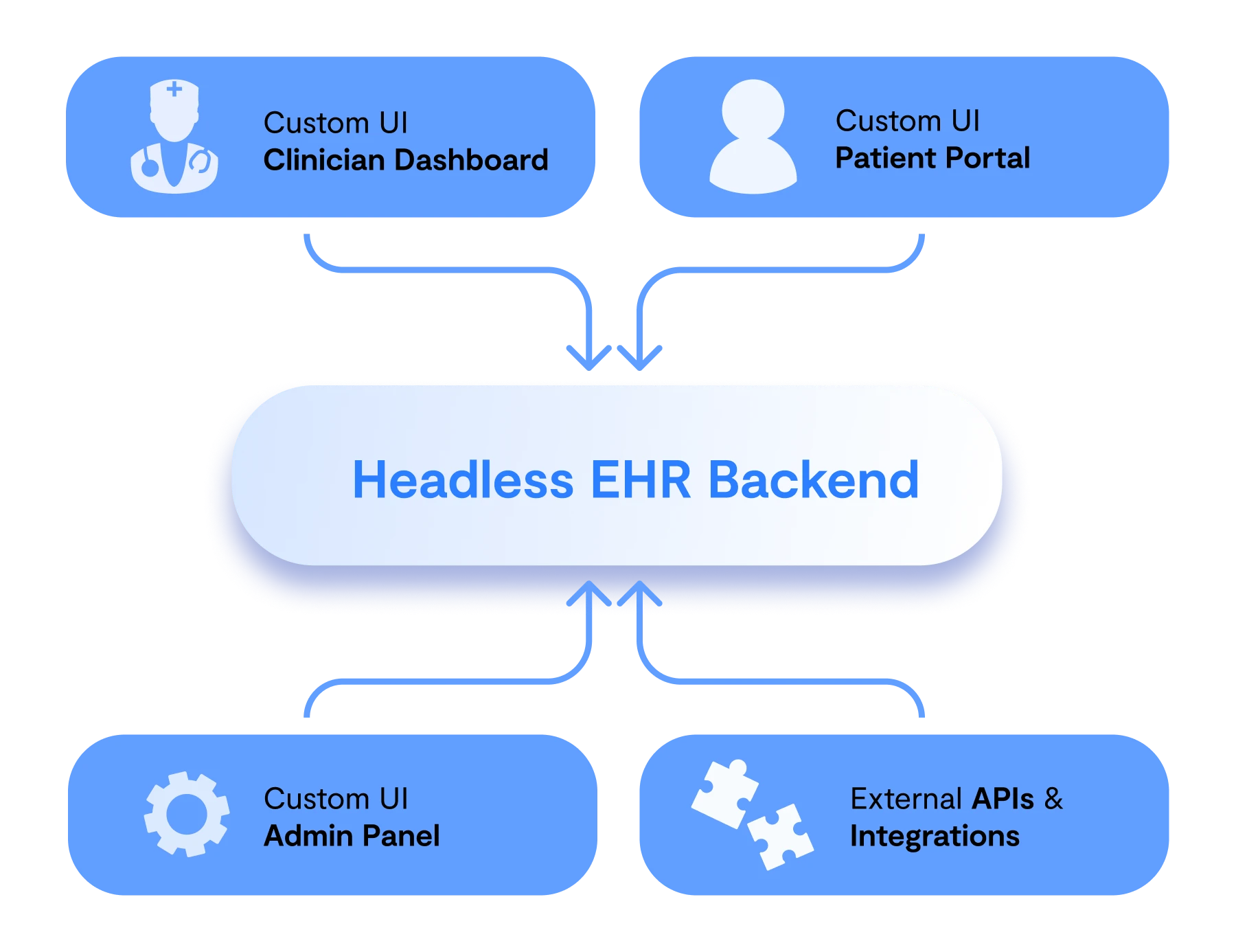 The diagram below visualizes how headless EHRs introduce modular UI components, ensuring scalability, extensibility, and API-driven interoperability:
