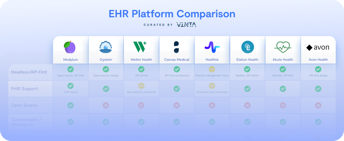 Headless EHR platforms meet these demands by separating backend data management from the frontend interface. This decoupling allows teams to create tailored workflows, seamless integrations, and custom user experiences. Below is a technical overview of several modern headless EHR platforms—including some we've worked with firsthand.