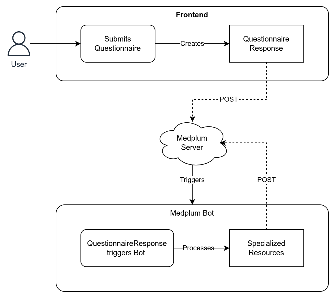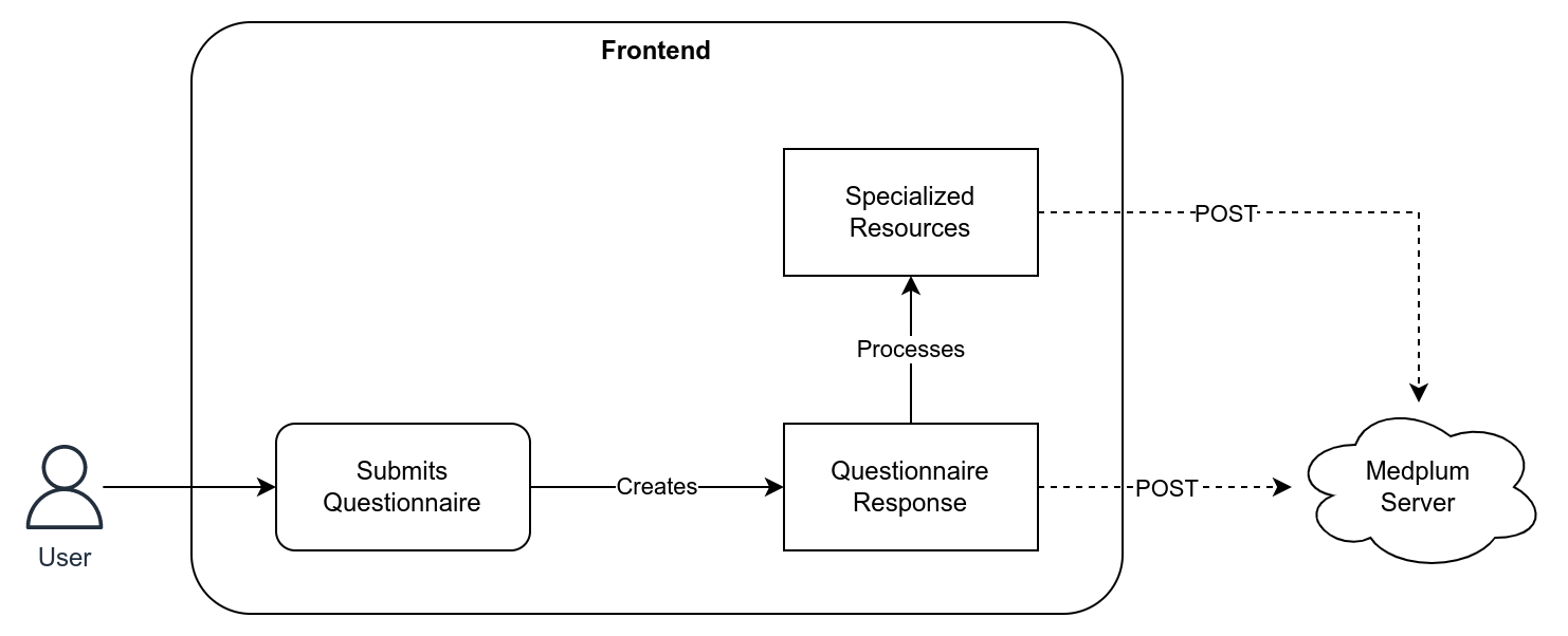 Since Medplum’s SDK is tailored to be used by a frontend application, it is possible to write any operation directly into the frontend code, for both the creation of a QuestionnaireResponse and the conversion into specialized resources. This approach is not ideal as it requires the developer to handle extensive data processing directly in the frontend, which might result in assigning specific permission levels to the user that wouldn’t be required otherwise, as well as negatively impacting the application’s performance.