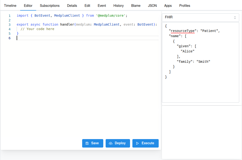 Once you have the code ready, click on Save, then on Deploy to apply the changes on Medplum’s server and deploy to AWS Lambda. This page lets us Execute a Bot at any time after deploying it, which is great for development and debugging purposes.