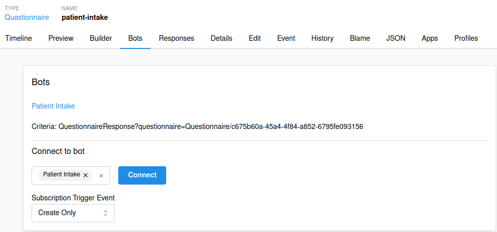QuestionnaireandQuestionnaireResponseuse cases; - Separating form logic from specialized resources. Doing so lets us choose when they are created, as we get to decide when the Bot should be triggered;