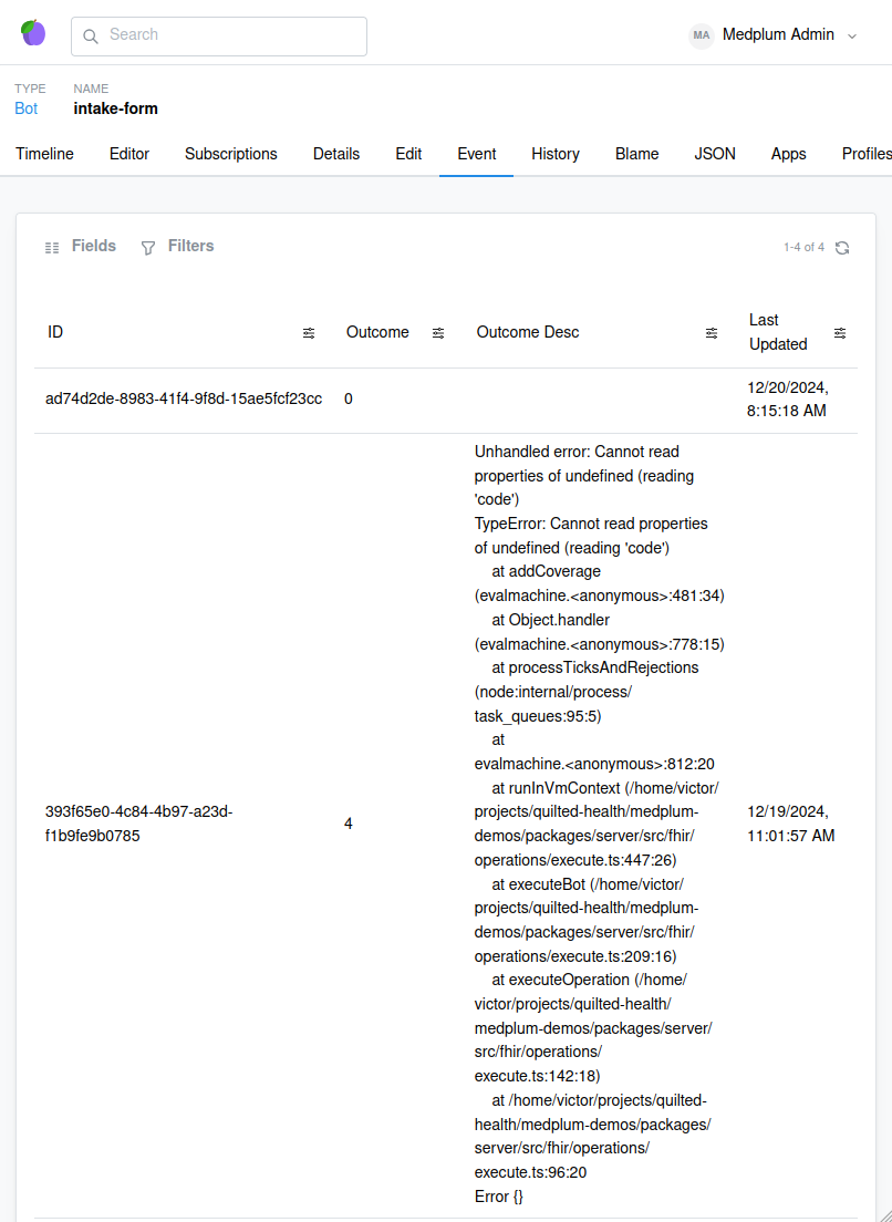 Just like any other code, Bots can fail. In order to give us visibility of when that happens, Medplum registers every Bot execution in the AuditEvent resource. The events are made available directly in the Bot’s page on Medplum’s admin interface.