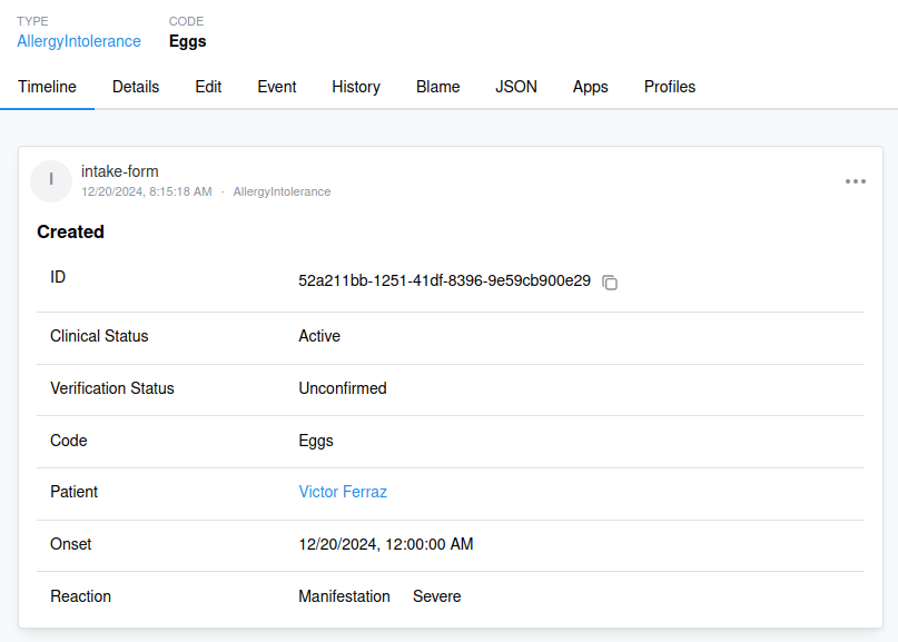 These answers can be mapped to two different resources: AllergyIntolerance and MedicationRequest, but we won’t be creating them in the frontend. Instead, the creation of the QuestionnaireResponse will trigger the Bot, which will then read the answers and create the necessary specialized resources.