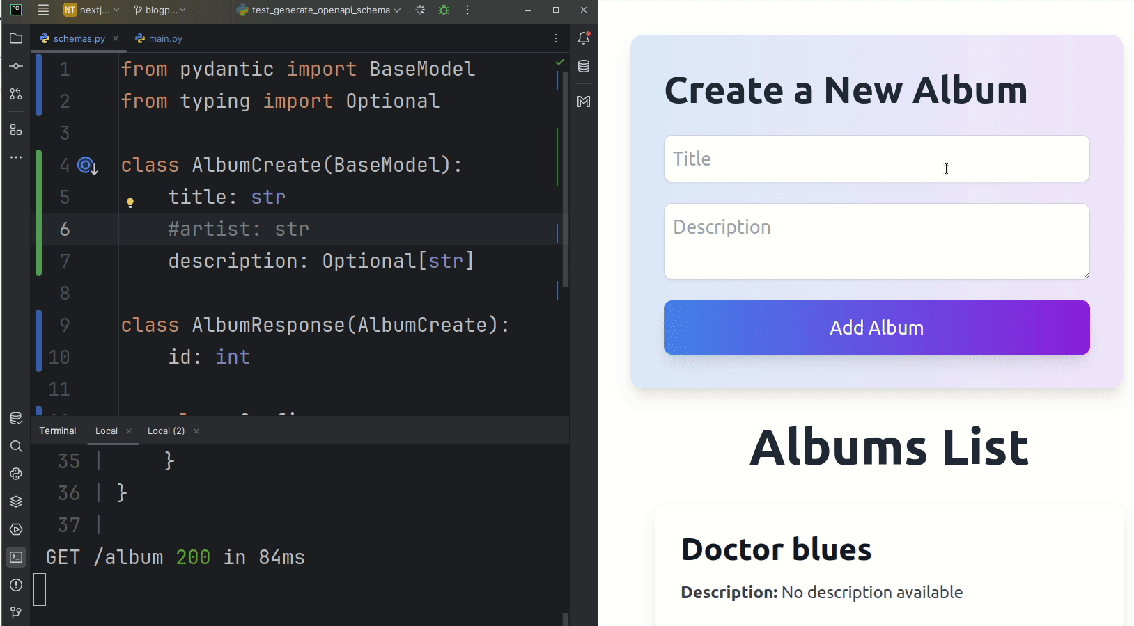 The key to generating a TypeScript client for our FastAPI backend is its ability to export an OpenAPI schema. Let’s start by checking our data models and endpoints. We have two album Pydantic models and two endpoints for creating and returning the albums.